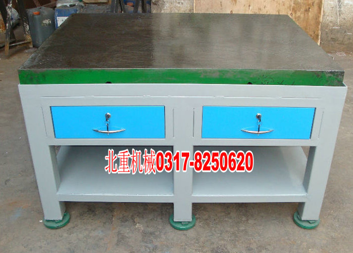 鑄鐵模具平臺結(jié)構(gòu):制成筋板式和箱體式,工作面有長方形、正方形或圓形,鑄鐵模具平臺工作面采用刮削工藝,工作面上可加工V形、T形、U形槽和圓孔、長孔等。鑄鐵模具平臺一般人認(rèn)為只要有一定的厚度,那么就不會(huì)發(fā)生形變,其實(shí)實(shí)際上并不是這個(gè)樣子的,鑄鐵模具平臺的結(jié)構(gòu)工藝也是尤為的重要。鑄鐵模具平臺結(jié)構(gòu)穩(wěn)定取決于平板的高度,板面的厚度,周邊圍子的厚度,拉筋的厚度及高度。而并不只是在于厚度。鉗工臺實(shí)心面板厚度為20mm,凈重約1.1T,材質(zhì)為HT200,硬度HB170-240,支架80*80方管,高度為550mm,加支架高度為800mm。