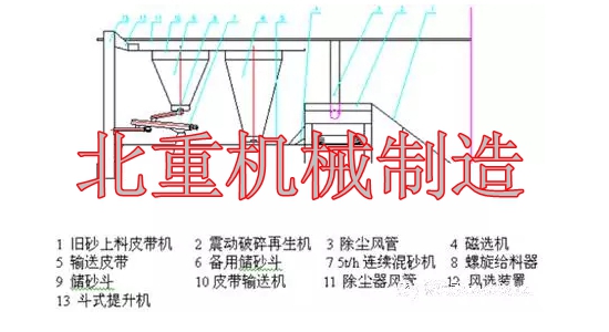 人工落砂后,舊砂通過上料皮帶機(jī)進(jìn)入振動(dòng)落砂機(jī)完成落砂、破碎、篩分,再生,經(jīng)過帶由磁選的輸送皮帶進(jìn)入斗式提升機(jī),在輸送過程中人工加入新砂。在斗提的出口處安裝風(fēng)選裝置,經(jīng)過風(fēng)選的型砂經(jīng)皮帶輸送機(jī)進(jìn)入儲(chǔ)砂斗。劃線平臺(tái)鑄件生產(chǎn)時(shí),型砂從砂斗經(jīng)螺旋給料器進(jìn)入混砂機(jī)。