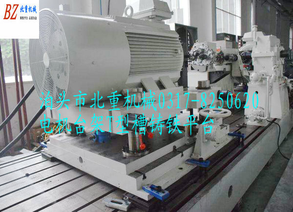 電機(jī)臺架T型槽鑄鐵平臺,T型槽鑄鐵平板工作面都加工有T型槽,中間距為200mm,一般用28t型螺絲,精度為2級。這樣的設(shè)計(jì)就是為了把電機(jī)定位在鑄鐵平臺上面,轉(zhuǎn)起來試驗(yàn),要得到數(shù)據(jù)等!